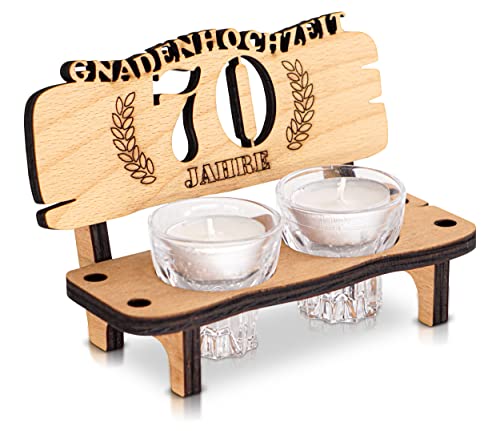 DARO Design – Schnapsbank 70. Hochzeitstag Gnadenhochzeit Geschenk Deko für Paare Männer Frauen aus Holz mit Gläsern und Kerzen
