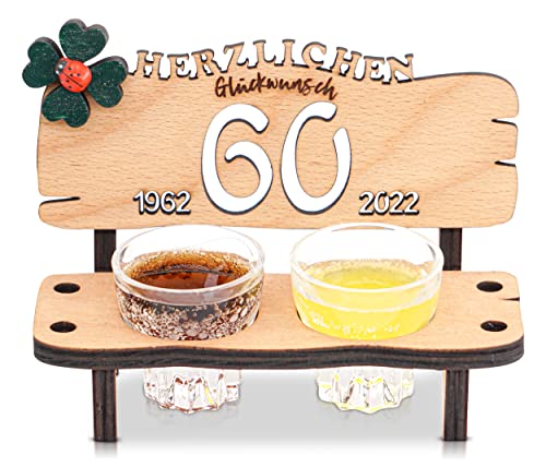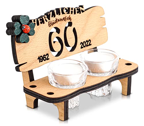 Details: DARO Design – Schnapsbank Jahreszahl 60 Jahre Holz 2 Schnapsgläser 2 Kerzen Kleeblatt Jahrestag Geburtstag…