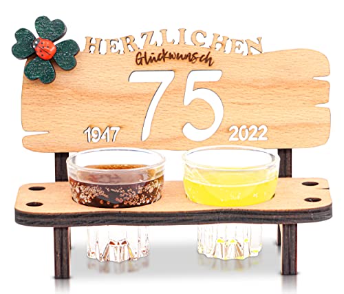 Details: DARO Design – Schnapsbank Jahreszahl 75 Jahre Holz 2 Schnapsgläser 2 Kerzen Kleeblatt Jahrestag Geburtstag…