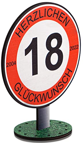 Rundes Schild aus Holz im Design eines kompletten Verkehrschildes mit Imitation der Metall Stange und einem runden Ständer mit Gras Dekoration und 12 Löchern im Durchmesser 5mm für Ihre eigene Weiterdekoration z.B. für Geburtstagskerzen oder zusammengerollte Geldscheine, Durchmesser des Kreises mit der Jahreszahl: 20cm – Aufschrift: Herzlichen Glückwunsch und die aktuellen Jahreszahlen 2004 – 2022