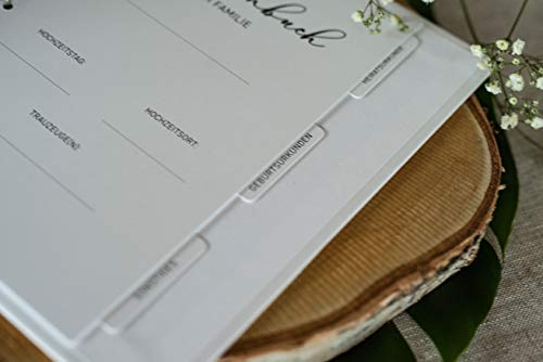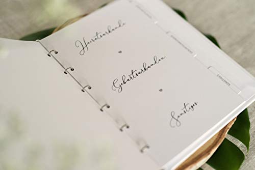 Die angesagten Designs und die Inhalte machen jedes unserer Familienstammbücher zu etwas ganz Besonderem. Die erste Inhaltsseite bzw. das Deckblatt kann nämlich handschriftlich mit persönlichen Angaben zum Familiennamen, Hochzeitstag, Hochzeitsort sowie zu den Trauzeugen vervollständigt werden. Die drei nachfolgenden Registerseiten bzw. Trennblätter sorgen mit den entsprechenden Kategorien „Heiratsurkunde“, „Geburtsurkunde“ und „Sonstiges“ für die nötige Ordnung und Übersicht.