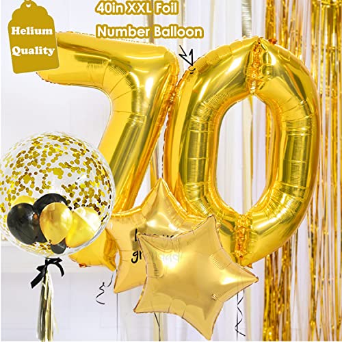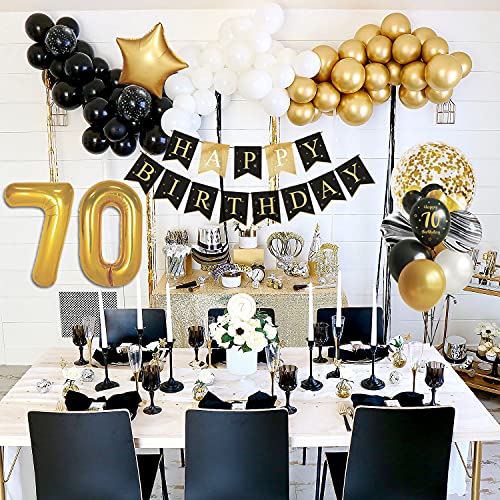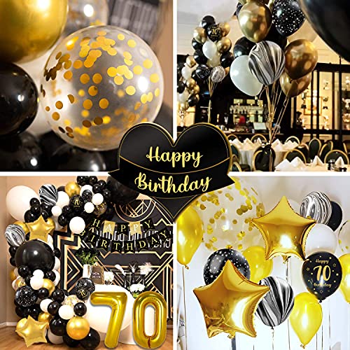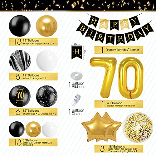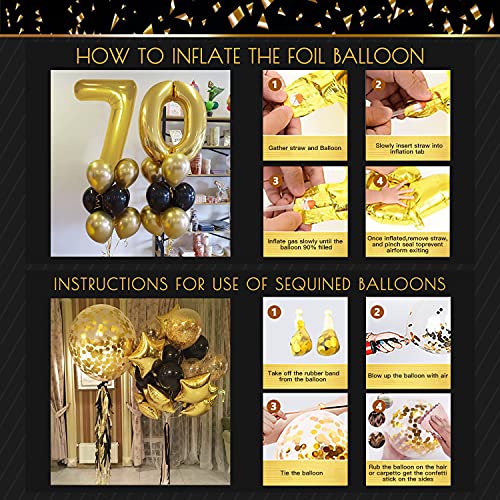 Schwarzes Gold Geburtstag 70 – Im Set enthalten: 1 Set „HAPPY BIRTHDAY“-banner, 16 x schwarze latexballons (schwarz + weiß), 13x golden metallballons, 5x schwarze achat ballons, 1x riesiger gold konfettiballon, 6x ballons bedruckt mit „70“, 2x stern folienballons, 1x satznummer „70“ folienballon, 16x fuß langes ballon bänder, 1x rollenband.