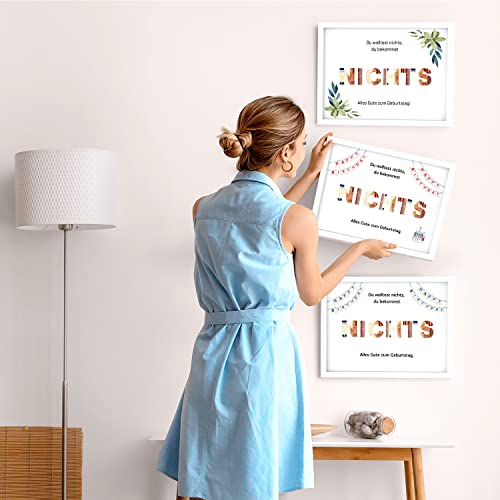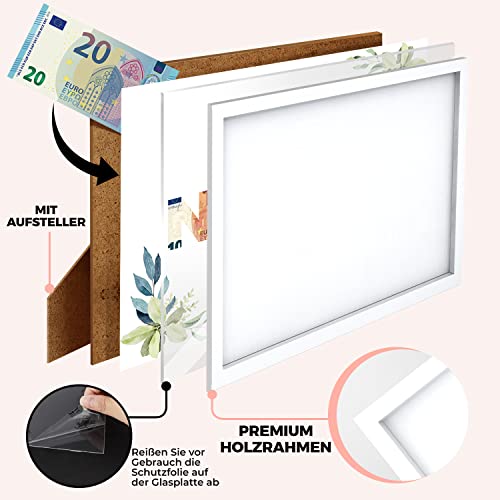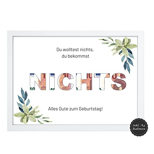 🎁 𝗟𝗔𝗡𝗚𝗟𝗘𝗕𝗜𝗚𝗘𝗦 𝗗𝗘𝗦𝗜𝗚𝗡 – Unser Geldgeschenk Set mit Bilderrahmen besteht aus einem hochwertigem Holzrahmen in weiß, einer schützenden Plexiglasscheibe und der erstklassigen mit „Nichts“ bedruckten A4 Karte – ein geschenkfertiges Geldgeschenk.