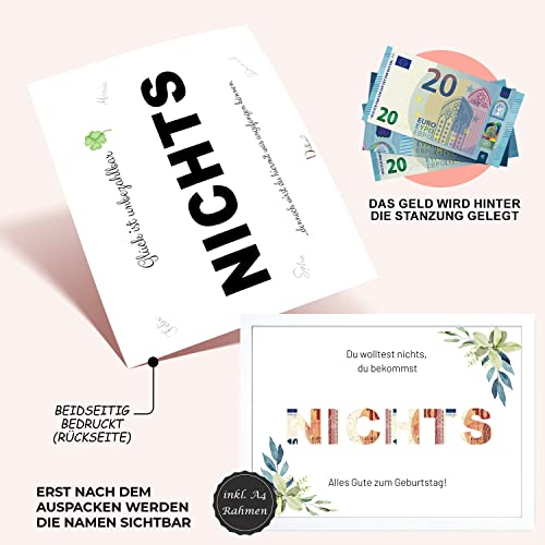 🎁 𝗙𝗨𝗡𝗞𝗧𝗜𝗢𝗡𝗔𝗟𝗘𝗦 𝗗𝗘𝗦𝗜𝗚𝗡 – Das Geldgeschenk mit Bilderrahmen für Geburtstage eignet sich für nahezu jeden Geldbetrag. Die Geldscheine müssen einfach beliebig hinter dem „Nichts“ platziert werden und danach zurück in den Bilderrahmen.