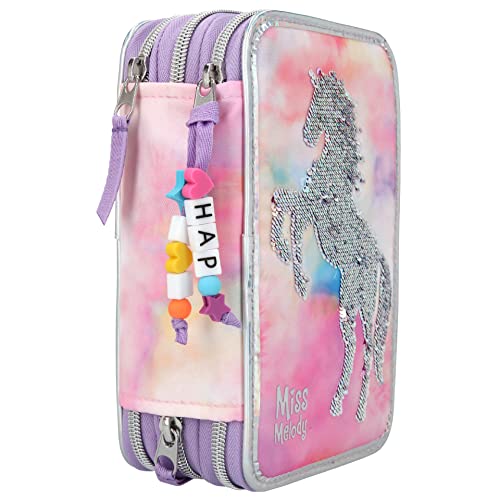 Details: Depesche 11074 Miss Melody – Gefüllte 3-fach Federtasche mit Pferde-Motiv aus Streich-Pailletten, rosa Federmappe ca. 7…
