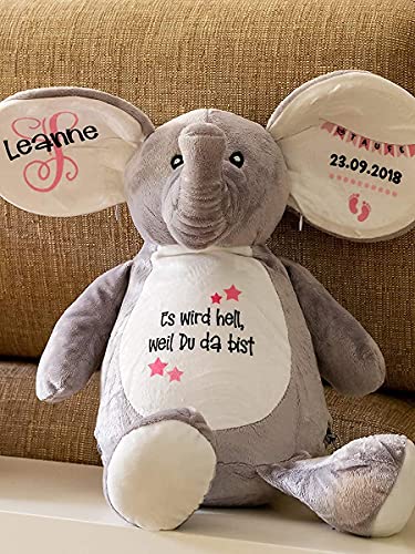 Ein Elefant zum Kuscheln und als tolle Geschenkidee für die Geburt oder die Taufe. Der Elefant kann an beiden Ohren und am Bauch mit Namen und weiteren Daten personalisiert werden. Das 46cm große Stofftier ist nicht nur ein individuelles Baby-Geschenk, sondern auch eine schöne Erinnerung für die Eltern. Das Innenpolster des Bauches kann herausgenommen und dafür z.B. eine kleine Decke für unterwegs reingelegt werden. Oder man hat einfach Platz für ein zusätzliches Geschenk. Auch an den Ohren sind Reißverschlüsse für kleine Fächer (z.B. für Geldgeschenke), vorhanden. +++Über die Personalisierungen+++ Auf dem rechten Ohr wird der Name des Kindes zusammen mit dem Monogramm des Anfangsbuchstabens gedruckt. Für Mädchen sind die Aufdrucke in rosa, für Jungen in blau gehalten. Auf dem linken Ohr wird der Elefant mit den Geburtsdaten (Geburtsdatum des Babys oder Taufdatum) und optional auch mit dem Geburtsgewicht / der Größe des Kindes personalisiert. Auf dem Bauch ist Platz für einen individuellen Wunschtext. Das können Glückwünsche oder persönliche Wünsche für das Kind sein, als Taufgeschenk auch der Taufspruch. Alle Daten können rechts eingetragen werden. Bei besonderen Wünschen kannst Du mich gerne kontaktieren. Bitte beachten: Jedes Motiv mit Name/Daten wird einzeln auf die Wackelohren und den Bauch bedruckt. In den Ohren befinden sich produktionsbedingte Fältchen. Wir bemühen uns die Ohren so glatt wie möglich zu ziehen, manchmal lässt es sich jedoch nicht vermeiden, dass ein kleiner Teil des Motivs genau in so ein Falte gedruckt wird.