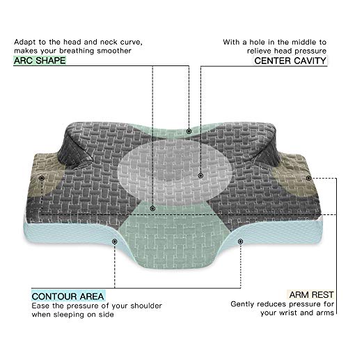 ERGONOMISCHES DESIGN: Das Kissen hält den Kopf in Schlafpositionen anatomisch korrekt. Es passt sich der Halskurve an und ermöglicht es dem Hals, sich auf natürliche Weise zu beugen. Der Bereich von Wirbelsäule, Kopf und Hals wird ideal und korrekt unterstützt. Die Ausschnitte an der Seite geben Ihrem Oberarm einen Platz zum Ausruhen und halten ihn in einem Winkel, damit Ihre Schulter nicht vor Ihnen gebeugt wird.
