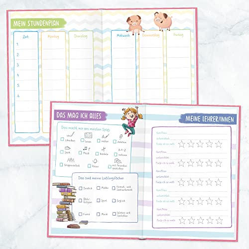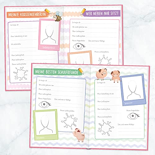 BUNT, FRÖHLICH, VIELSEITIG – Kindgerechtes Design mit viel Liebe zum Detail, originelle Fragen und Ausfüllfelder: Steckbrief , Schulfreundinnen und -freunde, Pausenspiele, Berufswunsch – und viele weitere schöne Erinnerungen!