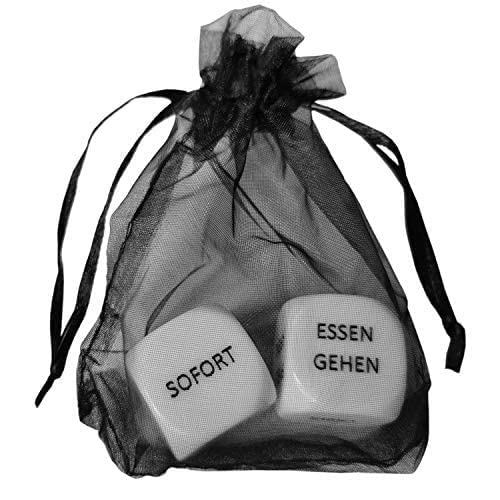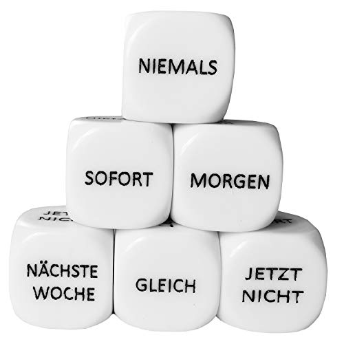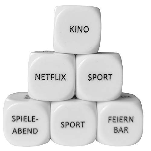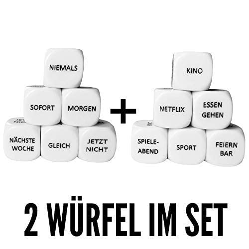 Je Bestellung: 2 Würfel (je Würfel ca. 2,5cm*2,5cm*2,5cm), mit 6 verschiedenen Seiten, Erster Würfel: 1) Sofort, 2) Jetzt nicht, 3) Morgen, 4) Gleich, 5) Niemals, 6) Nächste Woche; Zweiter Würfel: 1) Kino, 2) Essen gehen, 3) Spieleabend, 4) Netflix, 5) Sport, 6) Feiern/Bar