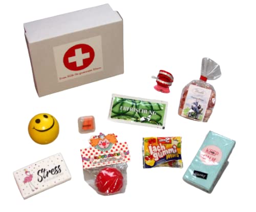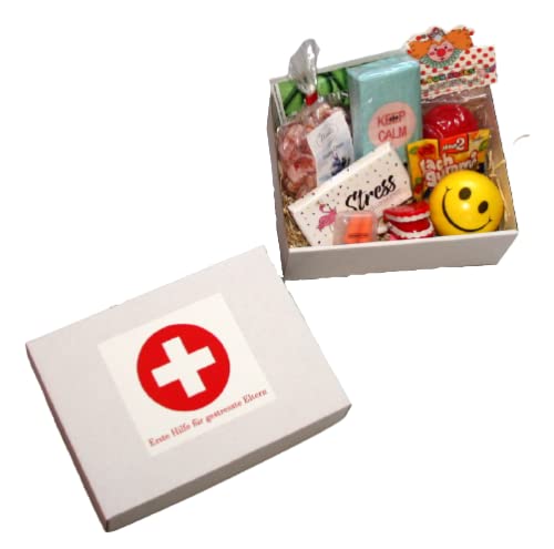 **Witziges Geschenk Eltern Baby – Anti-Stress Geschenk Box Eltern** Eine lustige Geschenkidee für die Eltern zur Geburt vom Baby. Geschenkbox mit Sticker versehen „Erste Hilfe für gestresste Eltern“ ist gefüllt mit den folgenden Anti-Stress Geschenken: – „Ruhestifter“ Ohrstöpsel, – Anti-Stress Smiley Knautschball, – Tüte Doping Drops Bonbons (125g), – Stressreduzierer Vollmilchschokolade (40g), – Hüpfendes lachendes Gebiss, – Packung „Keep Calm“ Taschentücher, – Premium Erfrischungstuch Aloe Vera, – Clownnase, – Tüte „Lach Gummi Minis“ (10,5g).