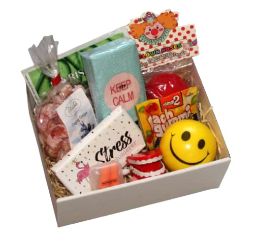 – „Ruhestifter“ Ohrstöpsel, – Anti-Stress Smiley Knautschball, – Tüte Doping Drops Bonbons (125g), – Stressreduzierer Vollmilchschokolade (40g), – Hüpfendes lachendes Gebiss, – Packung „Keep Calm“ Taschentücher, – Premium Erfrischungstuch Aloe Vera, – Clownnase, – Tüte „Lach Gummi Minis“ (10,5g).
