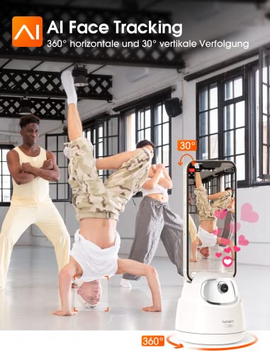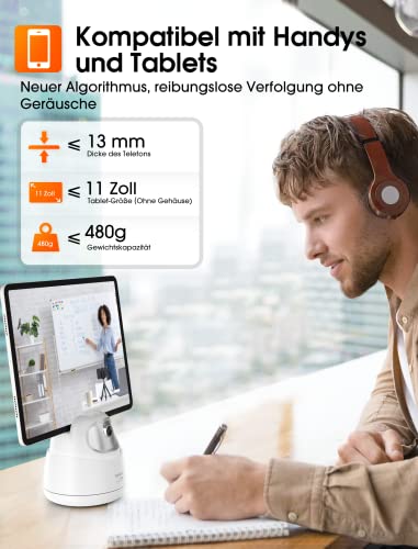 [Intelligente KI Gesichtsverfolgung] Mit dem hohem Algorithm erkennt und verfolgt dieses Auto Face Tracking Stativ Ihr Gesicht fließend und stetig ohne Geräusche. Bewegen Sie sich vor dem Bildschirm, diese Smart Handyhalterung verfolgt Ihr Gesicht und bewegt sich 360°, um sicherzustellen, dass Sie immer im Bild sind. Hohem 360° Auto Tracking Telefonhalter ist perfekt für Videoanrufe, Videoaufnahmen und Live-Streaming. Hinweis: Das Tracking Stativ kann keine schnell bewegten Objekte erfassen.