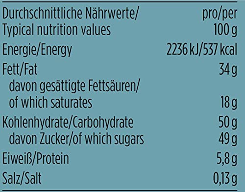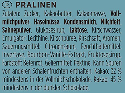 Zutaten: Zucker, Kakaobutter, Kakaobohnen, VOLLMILCHPULVER, HASELNÜSSE, KONDENSMILCH, BUTTERREINFETT, SAHNEPULVER, LAKTOSE, Glukosesirup, Emulgator: Lecithine, Kirschwasser, natürliche Aromen, Kirschen, Säuerungsmittel: Citronensäure, Feuchthaltemittel: Invertase, Farbstoff: Betenrot, Fruktosesirup, Bourbon-Vanille-Extrakt, Geliermittel: Pektine, Aroma. Kann Spuren von anderen Schalenfrüchten, Soja und Ei enthalten. Kakao: 32 % mindestens in der Vollmilchschokolade. Kakao: 45 % mindestens in der dunklen Schokolade.