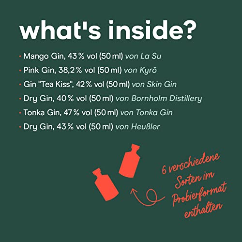 🍸Das Gin Tasting Set besteht aus 6 Flaschen Gin à 50ml von La Su, Kyrö, Skin Gin, Bornholm Distillery, Tonka Gin und Heußler.