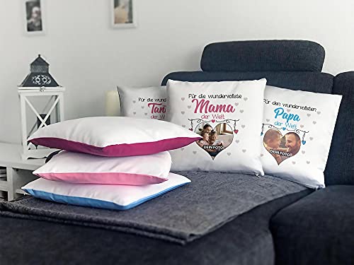 Ob als Kopfkissen, als Sofakissen, kleines Reisekissen oder einfach als schönes Zierkissen: Mit Foto und/oder Spruch bedruckt sind unsere Kissenbezüge ein tolles persönliches Foto-Geschenk für Groß und Klein. Ein Foto-Kissen ist eine ideale Möglichkeit, wundervolle Babyfotos, Partnerfotos, Familienfotos, Tierfotos oder die tollsten Urlaubsfotos auf besondere Art und Weise zu verschenken. So bleiben die schönsten, gemeinsamen Augenblicke in Erinnerung. Alle Kissenhüllen sind auf links gedreht gut waschbar und in unterschiedlichen Farben und Oberflächenstrukturen erhältlich. Eine passende Füllung ist natürlich gleich dabei. Durch den hochwertigen Fotodruck kommen alle Farben äußerst realistisch, lebhaft und brillant aus unserer hauseigenen Produktion – Made in Germany. Als kleines Lieblings-Kopfkissen für die Reise oder für das Mittagsschläfchen zwischendurch hat unser Kissen mit Foto das Potential zum absoluten Lieblingskissen. Das perfekte Geschenk und eine süße Erinnerung zum Muttertag, Vatertag, Geburtstag, Valentinstag, zu Weihnachten oder einfach nur so als Ausdruck von Liebe als kleine Aufmerksamkeit zwischendurch.