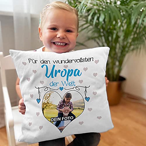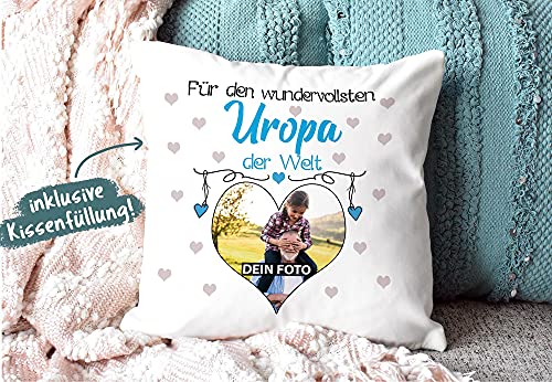 Einzigartiges, persönliches Fotogeschenk zum SELBST GESTALTEN – liebevoll designt – für den Wundervollsten Uropa – ein hochwertiges Fotokissen mit großem Wunschfoto in Herzform für den besten Uropi als Geschenk zum Vatertag, Geburtstag, zu Weihnachten, zum Danke sagen – einfach zu jedem Anlass die passende Geschenkidee