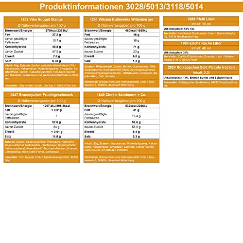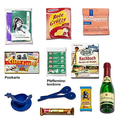 24 OSTPRODUKTE in GESCHENK BOX: Trabi Puffreis Schokolade, Wikana Butterkeks Wittenberger, Pfeffi 5 Stangen, Liebesperlen Babyfläschchen 70g, Eierpieker Eierstecher, Eierlöffel 2Stück, Crottendorfer Räucherkerzen, Viba Nougat Stange, Kleiner Maulwurf Schokotäfelchen, Zitronenkissen Viba, Chokis Sandmann + Co., Grießbrei Komet, Flaschenöffner „Faust“, Rote Grütze Komet, Aufkleber Schriftzug „DDR“, Held der Arbeit Button, Doppelkeks Mini Kakaocreme Wikinger, Pfeffi Likör, Krügerol Halsbonbons…