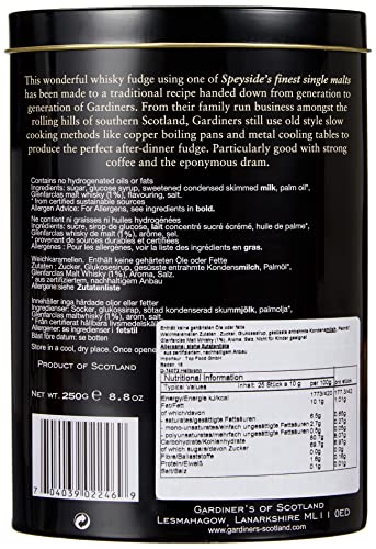 LIEFERUMFANG: Sie erhalten 1 x 250 g Gardiner´s of Scotland Whisky Fudge „Glenfarclas“ – In hochwertiger Blechdose (ca. 11,5×16,5×5,5 cm) – Jedes Fudge ist einzeln verpackt