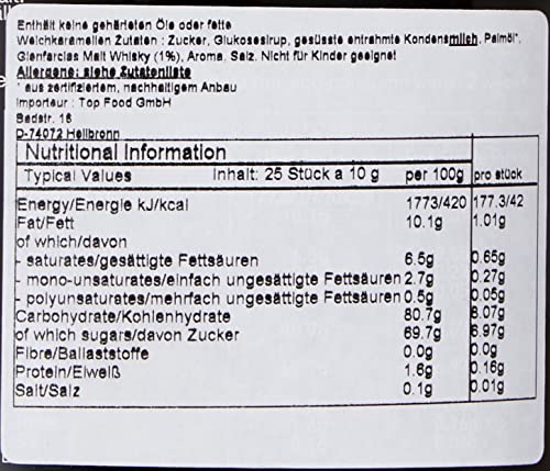 Zutaten: Zucker, Glukosesirup, gesüßte entrahmte KondensMILCH, Pflanzenfett, Glenfarclas Single Malt Whisky, Aroma, Salz
