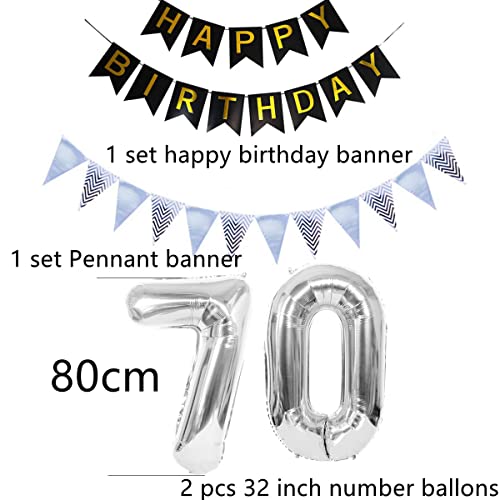 🎈70. Geburtstags dekorationen Schwarz/ Silber set: 1 set „Happy Birthday“ Banner, 1 x Wimpel Banner(12pcs) ,2 x 18“ Silber Liebe Herz Folienballons, 2 x 18“ Silber Star Folienballons,2 x 18“ Schwarz Star Folienballons, 2 × 32“ Digital Silber“70″ Folienballons, 8 x 12“ Konfetti Ballons, 8 x 12“ Rose Gold Latex Ballons, 1 x Band.
