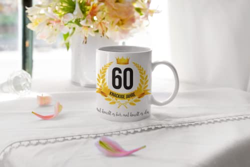 Das perfekte Geschenk zum Geburtstag. Beidseitig bedruckte Tasse mit 60 knackige Jahre Mal knackt es hier, mal knackt es da.