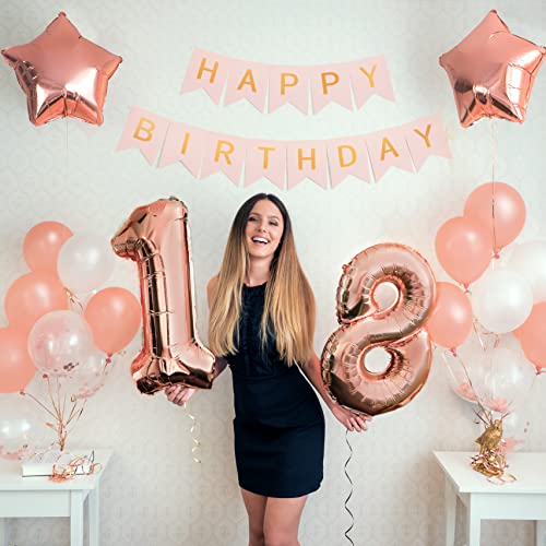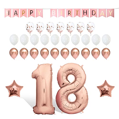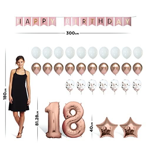🎈 18. GEBURTSTAG DEKO ROSEGOLD – 18er Folienballons im Set: 32″ (81cm, rose) + Happy Birthday Girlande + 20 Latex Luftballons (Weiß & Rosé) + 7 Konfetti Luftballons. Hochwertig verarbeitet, für eine gelungene Überraschung.