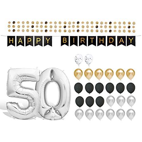 🎈 50. GEBURTSTAG DEKO – 50er Folienballons im Set: 32″ (81cm, silber) + Happy Birthday Girlande + 24 Latex Luftballons (Gold, Silber & Schwarz) + 2 Konfetti Luftballons + Tischdeko. Hochwertig verarbeitet, für eine gelungene Überraschung.