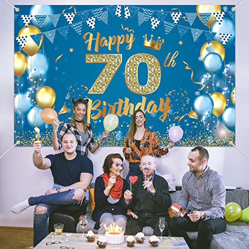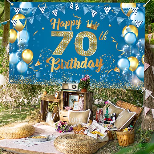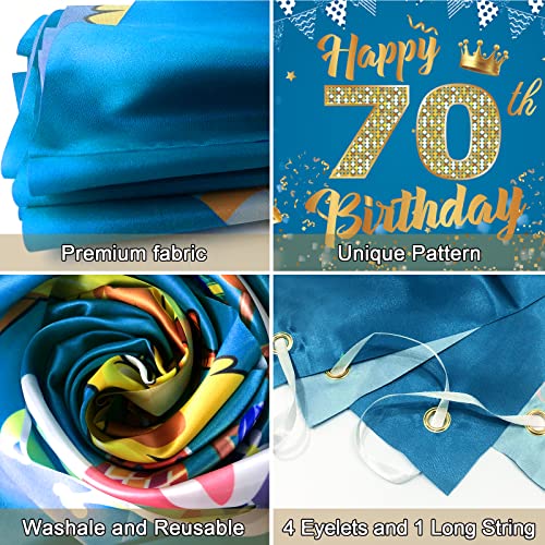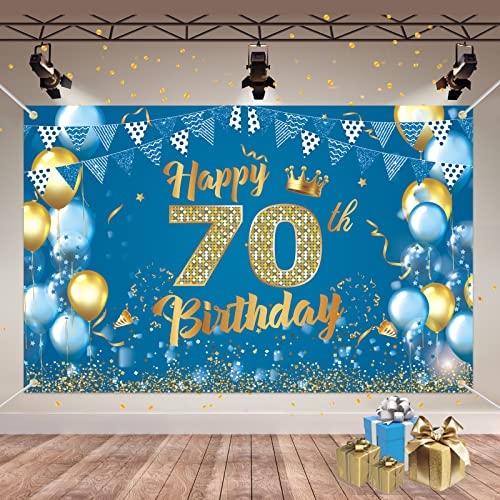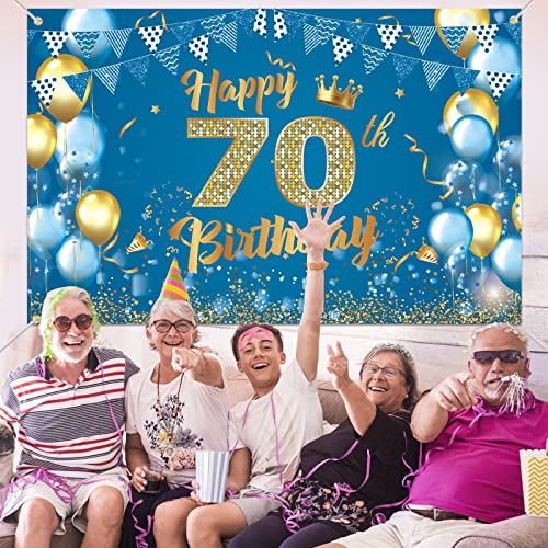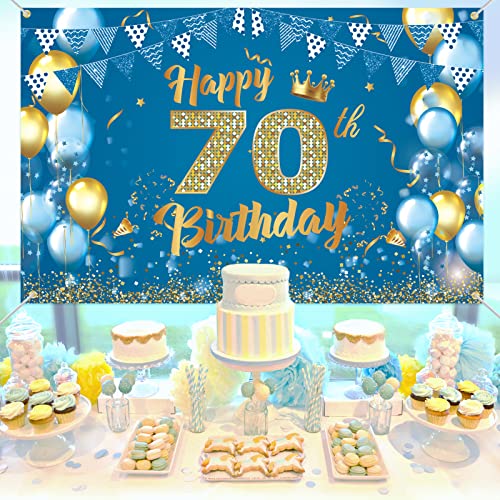 Wunderschönes Banner zum 70. Geburtstag: Dieses glänzende Wanddekorations-Banner ist speziell für Partys zum 70. Geburtstag. Der blaue Hintergrund zeigt die auffälligen Buchstaben „Happy 70th Birthday“ und goldene Geburtstagsmuster, wie Wimpelkette, Konfetti und Luftballons. Es ist definitiv ein lebendiger Geburtstag Hintergrund für Männer und Frauen.
