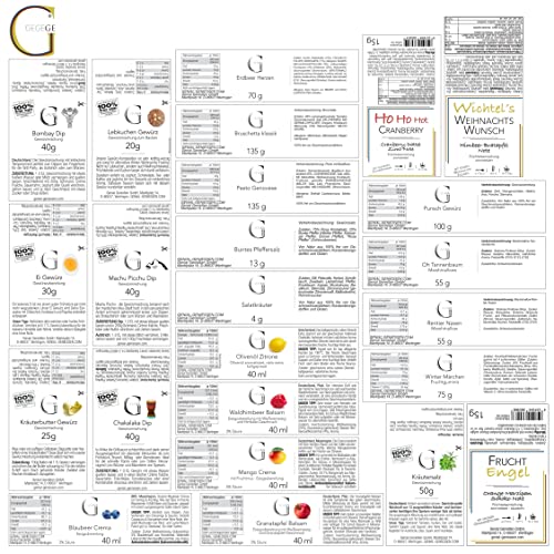 Adventskalender Frauen & Männer · 24 Seelengenüsse für Küchenhelden, Salatfans und Genießer. Besondere Essige, Öle und Gewürze: Blaubeer Crema 40ml Granatapfel Balsam 40ml Mango Crema 40ml Waldhimbeer Balsam 40ml Olivenöl Zitrone 40ml Chakalaka Dip-Gewürz 40g Bombay Dip-Gewürz 40g Machu Picchu Dip-Gewürz 40g Ei Gewürz 30g feinste Pestos, Kräuter- & Gewürz-Spezialitäten: Pesto Genovese 135g Bruschetta Creme 135g Punsch Gewürz 100g Lebkuchen Gewürz 20g Kräuterbutter Gewürz 25g Salatkräuter Reagenzglas 4g Kräutersalz Reagenzglas 14g Buntes Pfeffersalz Reagenzglas 13g weihnachtliche Tees & Süßes für Feinschmecker: Fruchtengel Tee 15g Wichtel´s Weihnachtswunsch Tee 15g HoHoHot Cranberry Tee 15gOh Tannenbaum – Marshmallow 55g Rentier Nasen – Marshmallow 55g Winter Märchen Fruchtgummis 75g Erdbeer Dinkel Herzen 70g