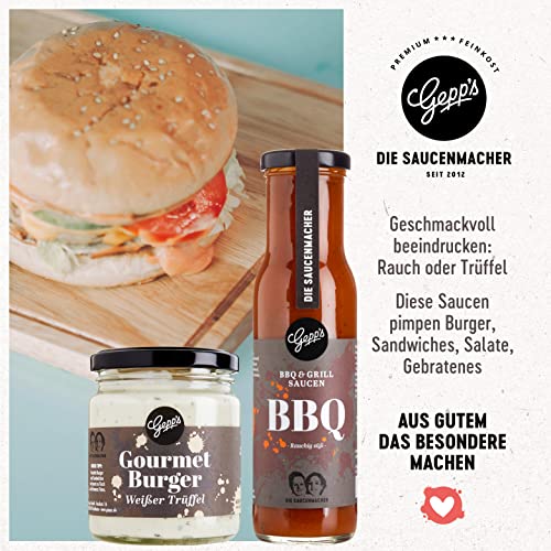 EINFACH ZUM REINBEISSEN: Was schmeckt besser als ein Burger? Ein selbstgemachter Burger! Ob als Geschenk für Grillmeister und Gourmets oder zum Selber-Grillen. Ob mit Hackfleisch-Pattie, Steak oder vegetarisch. Ein echter Gepp`s Burger geht einfach immer. ***Unsere Gourmet Burger Sauce und unsere BBQ Sauce sind aktuell leider ausverkauft. Stattdessen wird unsere Fisch Burger Sauce und unsere Whiskey Pfeffer Sauce geliefert.***