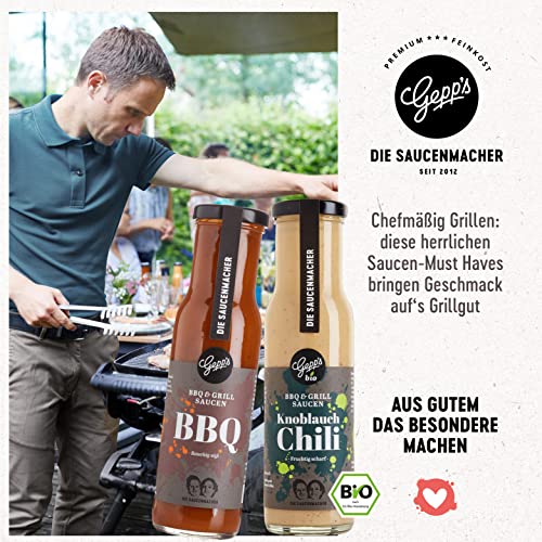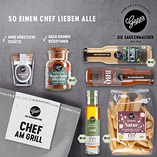 Details: Gepp’s Feinkost ,,Chef am Grill“ Geschenkkorb für Männer I Köstliches Grill-Geschenk mit 2 x Grillsaucen, Chili-Öl…