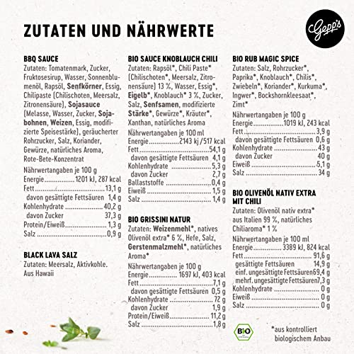 EINE TÜTE VOLLER ÜBERRASCHUNGEN: Unser Gourmet Grill-Set hält für alles eine Überraschung bereit: Black Lava Salz für Fleisch, Fisch & Meeresfrüchte, Magic Spice BBQ Rub als ideale Marinade, Chili Öl für den scharfen Kick, Grissini als knackige Beilage & würzig-scharfe BBQ- & Knoblauch-Chili Saucen veredeln jede Mahlzeit – ganz egal, ob auf dem Grill oder in der Pfanne.