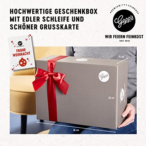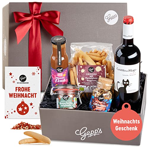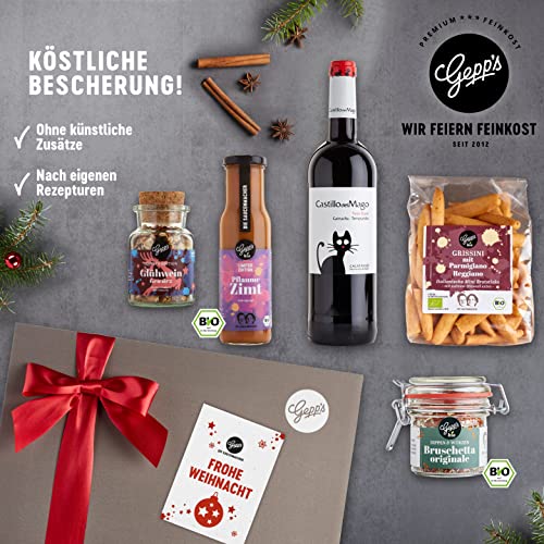 Details: Gepp’s Feinkost „Frohe Weihnacht“ Geschenkbox I Mit Delikatessen wie edlem spanischem Rotwein, Glühweingewürz, Pflaume-Zimt Sauce und mehr I Hochwertiges Geschenk für Männer und Frauen