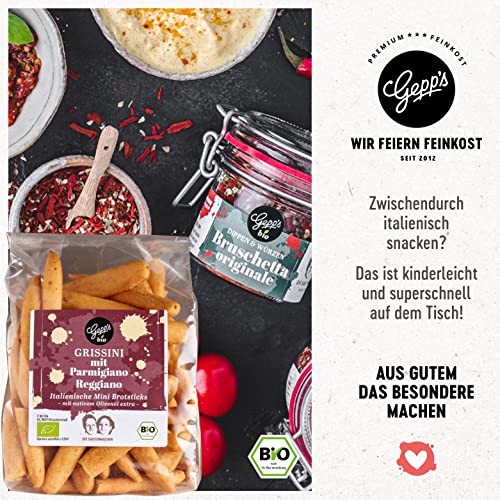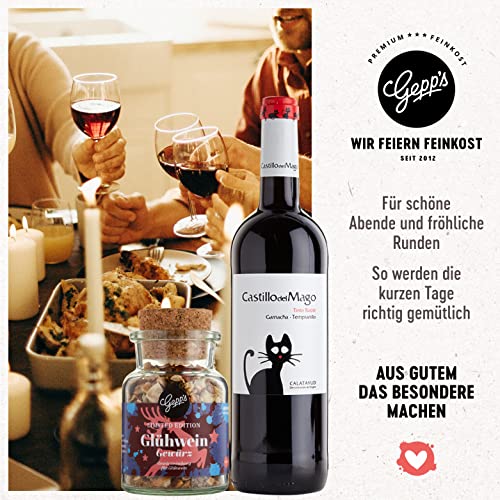 DAS ERWARTET FEINSCHMECKER – Unsere weihnachtliche Bio Pflaume-Zimt Sauce, passend dazu Gepp’s Glühwein Gewürz für feinsten hausgemachten Glühwein und hochwertiger Rotwein aus Spanien. Abgerundet wird die Geschenkbox mit zwei italienischen Klassikern: unser Bruschetta-Dip und würzige Grissini mit Parmigiano Reggiano.