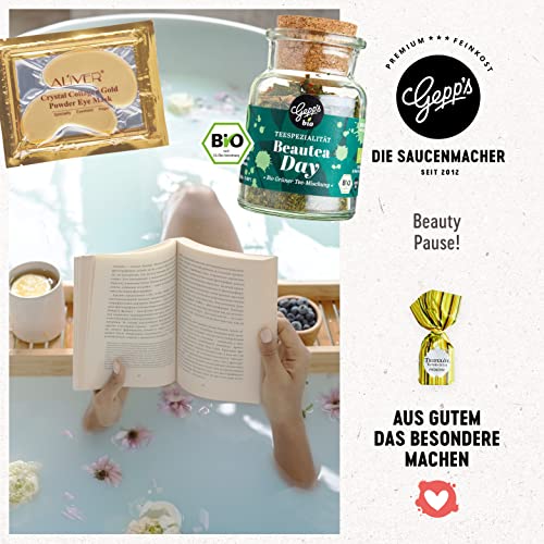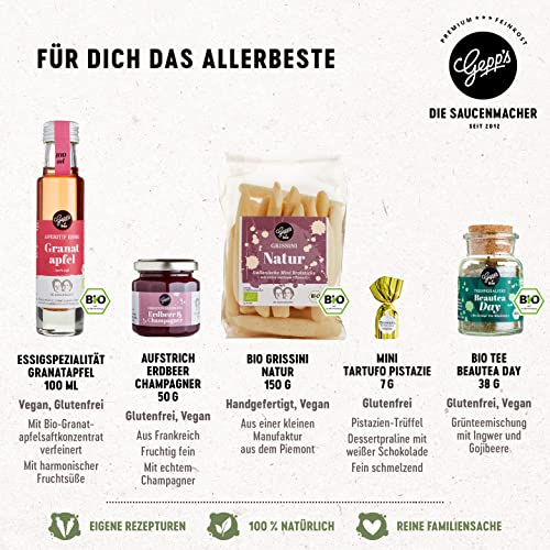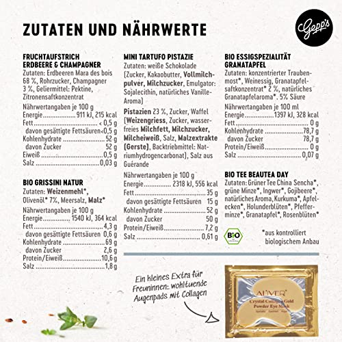 NUR DAS BESTE FÜR DIE BESTE: Französischer Erdbeer-Champagner Fruchtaufstrich, aromatischer Bio-Tee ,,Beautea Day“, köstlicher Bio Granatapfel-Essig, original italienische Bio Grissini, zart schmelzende Tartufi Dolce Pistazie und Augenpads zum Entspannen sorgen für einen wunderbares Geschenk.