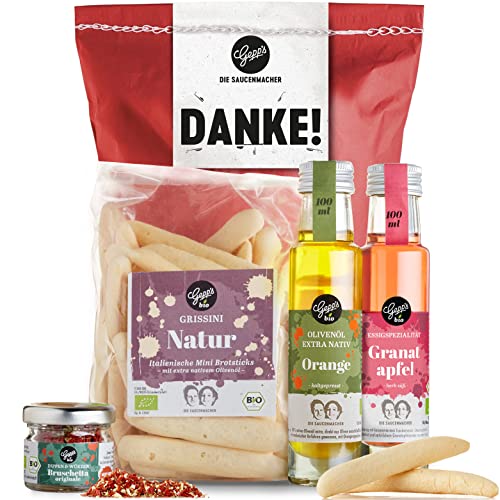 ÜBERRASCHUNG FÜR FEINSCHMECKER: Gefüllt mit einer Auswahl an besten italienischen Spezialitäten, macht diese Geschenktüte Gourmets und Kochfreunde glücklich: italienisches Bio-Olivenöl mit Orangenaroma, fruchtiger Bio-Granatapfel-Essig, knusprige Bio-Grissini aus dem Piemont und aromatischer Bruschetta-Dip in Bio-Qualität.