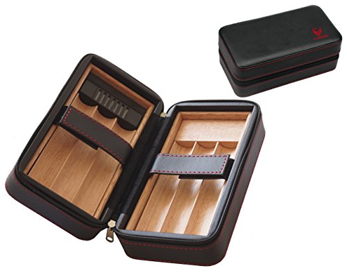 Für den stilvollen Transport von Zigarren unterwegs, im Auto, auf Reise, im Koffer. Für Zigarren mit bis zu 2,2cm Durchmesser, also etwa auch Robusto Zigarren. Diese Kassette beinhaltet einen Kern aus spanischem Zedernholz. Ein Befeuchter ist ebenso enthalten, bei verschlossenem Humidor aber nicht unbedingt notwendig (abhängig von den Umgebungsfaktoren und er Lagerungsdauer). Der Zedernholzkern wird umschlossen von einem Etui (Case), das über flüssig laufen Reißverschluss verschlossen wird. Die Ablagen sind für Zigarren mit bis zu 2,2cm Durchmesser und bis zu 15cm gedacht. Mittels des Holzstücks lässt sich die Länge entsprechend verkürzen: Mit Holzkeil 12,50 cm, ohne Holzkeil 15,00cm. Ein Gurt sichert die Zigarren unterwegs im Reisehumidor.