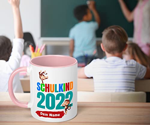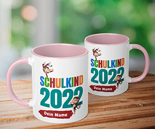 Details: Geschenk zur Einschulung für Mädchen und Jungen: „Schulkind 2023“ – mit AFFEN-Motiv – personalisierte Tasse mit Namen…