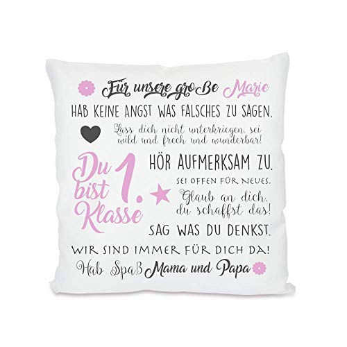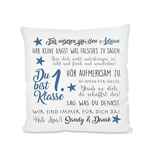 Details: Geschenk zur Einschulung für Schulanfänger – Kissen mit Name des Erstklässlers, in zwei Farben für Mädchen und Jungen