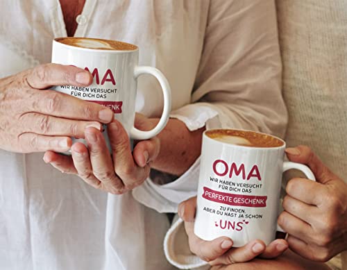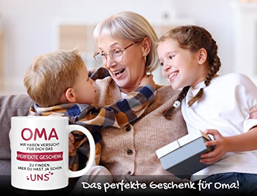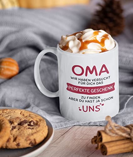 OMA GESCHENK TASSE – Es ist nicht so einfach, das passende Geschenk für Deine Oma zu finden. Diese liebevolle Tasse mit dem Spruch „Oma – Wir haben versucht für Dich das perfekte Geschenk zu finden. Aber Du hast ja schon UNS“ bringt jede Oma zum Schmunzeln. Ideal als Geschenkidee für Deine Oma zum Geburtstag, Muttertag oder Weihnachten.