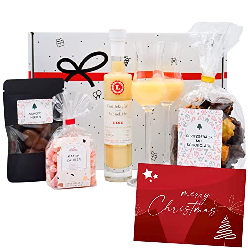 🎄 Weihnachtlicher Präsentkorb gefüllt mit bestem Inhalt: Sahne Likör, Spritzgebäck Kekse, Orangen-Glühwein Süßigkeiten, Schoko Pralinen & Weihnachtskarte. Verpackt in der edlen Geschenkbox