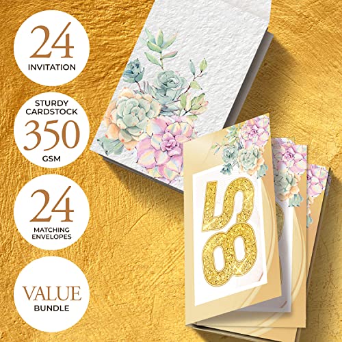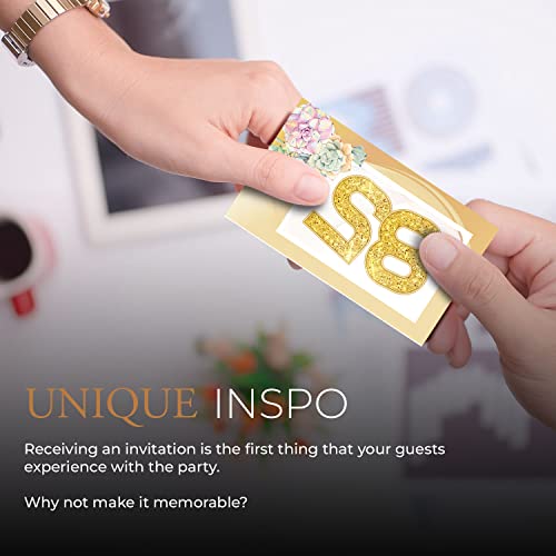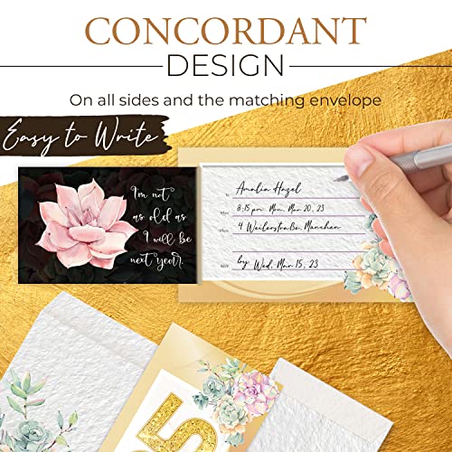 Einladungskarten mit ein Bild mit goldenen Zahlen und Sukkulenten auf der Vorderseite und einem leeren Bereich auf der Innenseite.