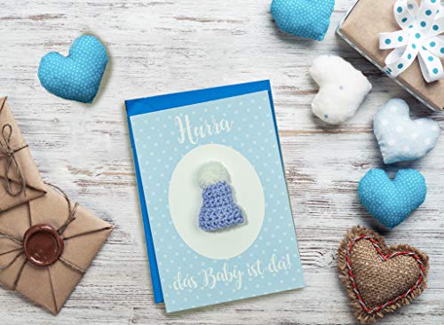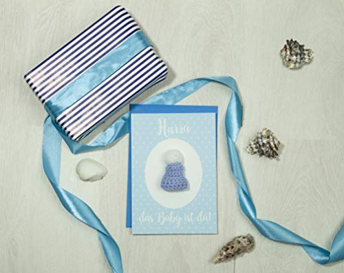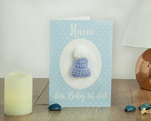 HANDMADE: Die Mütze ist ca. 4 cm groß und wird von uns in Handarbeit gehäkelt. Die Baby Karte Geburt hat ein süßes Design. Ein schönes Geburtsgeschenk für Neugeborene.