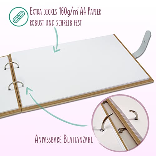 PAPIER: Enthalten sind 55 weiße DIN A4 Blätter (=110 Seiten) aus 160g/m² Papier die einfach und flexibel entnommen, ergänzt oder ausgetauscht werden können.