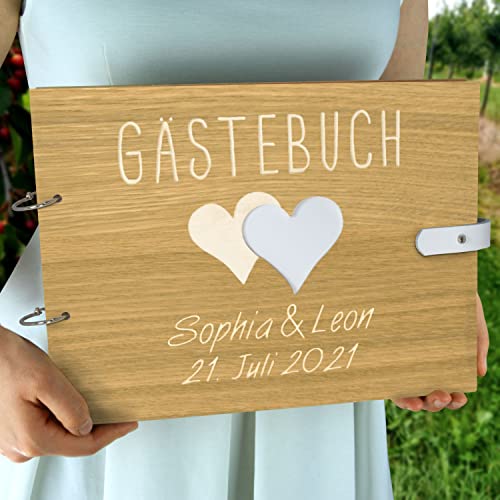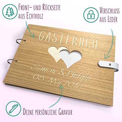 Details: Großes Hochzeit Gästebuch aus Holz mit personalisierter Gravur & Lederverschluss | 110 Seiten DIN A4 Papier – 310 x 230…