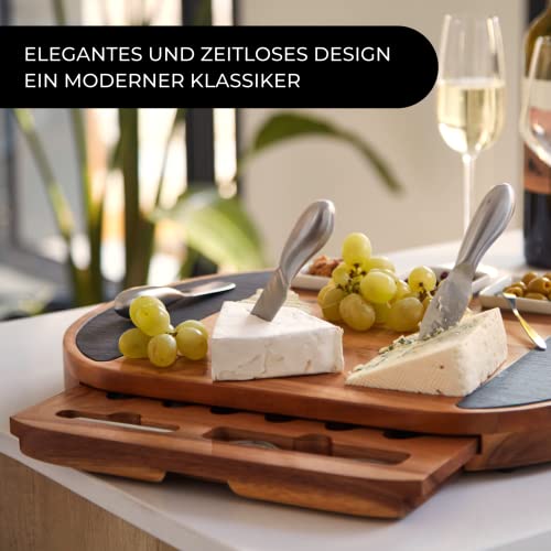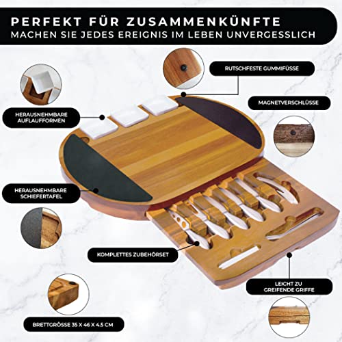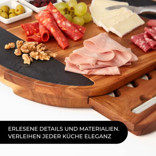 GEBEN SIE IHRER KREATIVITÄT FREIHEIT, OHNE ZEIT ZU VERLUSTEN: Unser Schneidebrett umfasst Zubehör, Schieferplatten und Schalen sowie Messer, Gabeln und Utensilien aus rostfreiem Stahl, die Sie ohne Bedenken in der Spülmaschine reinigen können.