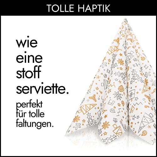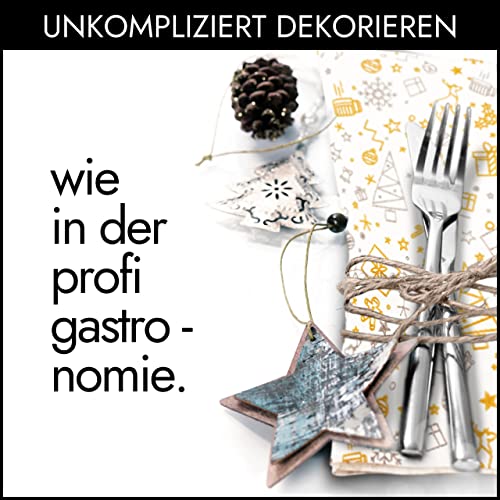 PREMIUM WEIHNACHTSSERVIETTEN „GOLD & SILBER“ – Die gehobene Gastronomie ist im täglichen Geschäft von unseren AIRLAID Servietten absolut überzeugt! 40×40 cm groß und eine 1⁄4 Falz bieten die optimale Größe für verschiedenste Faltungen!