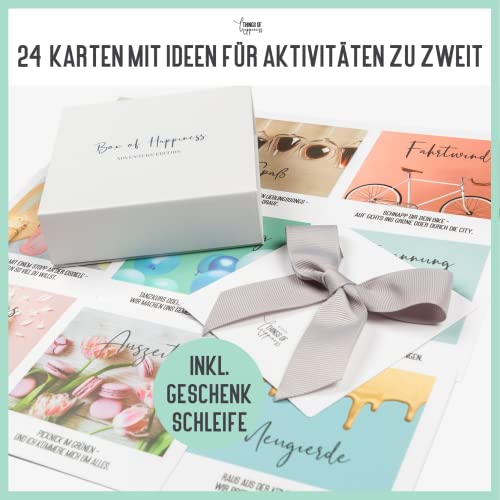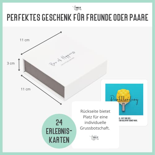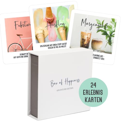 ✨ 24 Karten = 24 ERLEBNIS-GUTSCHEINE » Auf jeder der 24 Karten steht eine Idee für eine gemeinsame Freizeit-Aktivität, ein besonderes Date oder Bucketlist Abenteuer. Mit der Box of Happiness verschenkst Du Zeit zu Zweit und unvergessliche Erinnerungen an lustige Abenteuer und glückliche Momente.