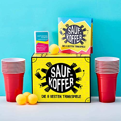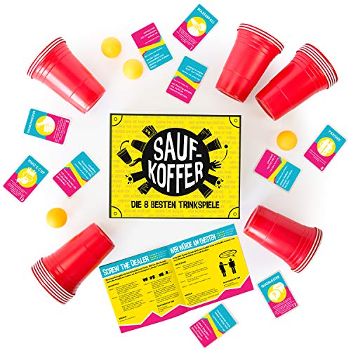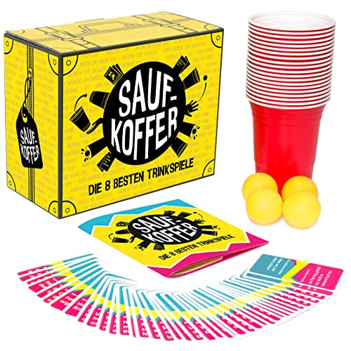 ✔️ HOCHWERTIGES TRINKSPIEL – Enthält 20 Wiederverwendbare rote Plastikbecher, 4 Tischtennisbälle, ein Saufkoffer-kartenspiel und Regelheft. Ihr Müsst Lediglich Freunde und Alk Beschaffen. Party Spiele für Erwachsene.