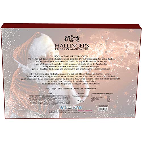 Sie suchen einen Pralinenkalender mit Eigenmotiv? Sprechen Sie uns an und definieren Sie bei größeren Stückzahlen das Motiv selbst! ALLERGENE: Kann Spuren von Gluten und Nüssen enthalten. Enthält: Haselnüsse, Macadamianüsse, Mandeln, Milch, Sojabohnen, Sulfite, Walnüsse. — Hinweis zu(r) Primärzutat(en): Kakao nicht aus Bayern/DE stammend